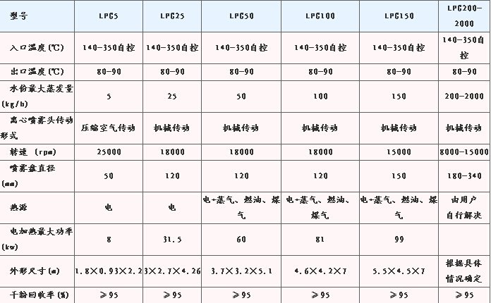 注:水份蒸发量与物料及热风出口温度有关。另可根据客户要求制作各种非标规格的喷雾干燥机